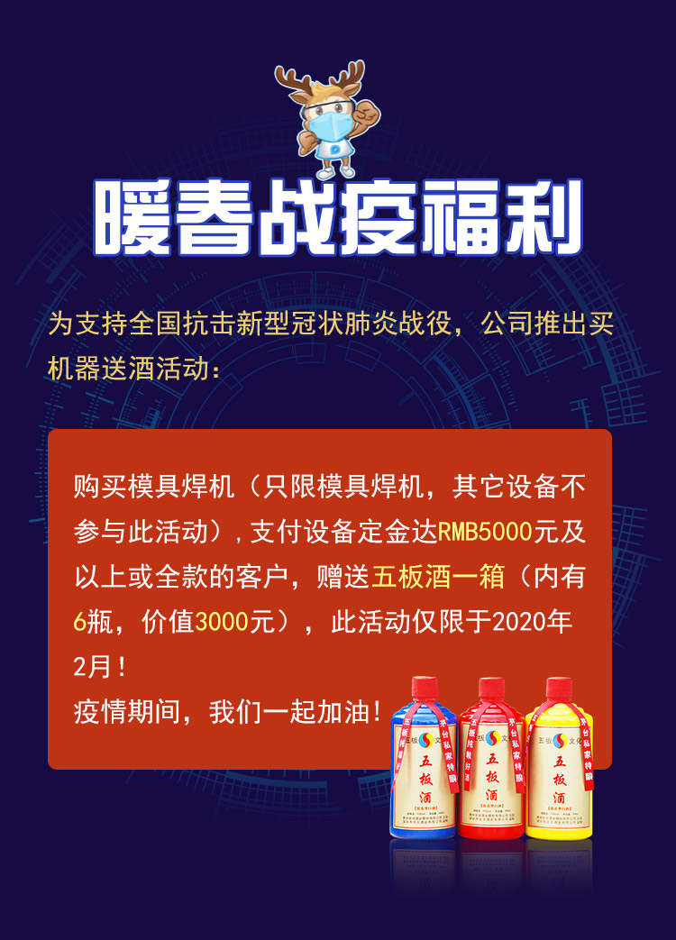 為支持全國抗擊新型冠狀肺炎戰役,助力各企業復工復產,通發激光推出買激光模具焊接機送酒活動: