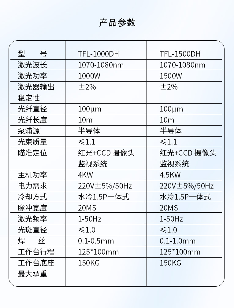 采用光纖激光器,反射率高,能量強(qiáng),免維護(hù),免調(diào)光,功耗少,相比傳統(tǒng) 模具焊來(lái)說(shuō),體積小,安全,穩(wěn)定性好超長(zhǎng)使用壽命。 1000W光纖激光器,滿足銅、鋁焊接量大的模具及產(chǎn)品焊接加工需要。 高承重底座及工作臺(tái),保持輕便靈活的優(yōu)點(diǎn),同時(shí)提供更高承載能力。 配備.1.5P大功率一體式水冷水機(jī),保證了大功率焊接的穩(wěn)定性。
